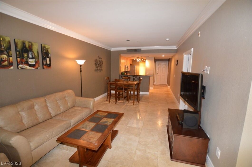 FULLY FURNISHED MERIDIAN LUXURY 2bdr/2bath CONDO w/ wood laminate flooring. Community is located 1-1/2 blocks to the heart of the strip. Unit is fully equipped with stainless steel appliances also featuring crown molding, Stone and Wood flooring, granite counter tops, covered patio, additional storage available in patio area etc.